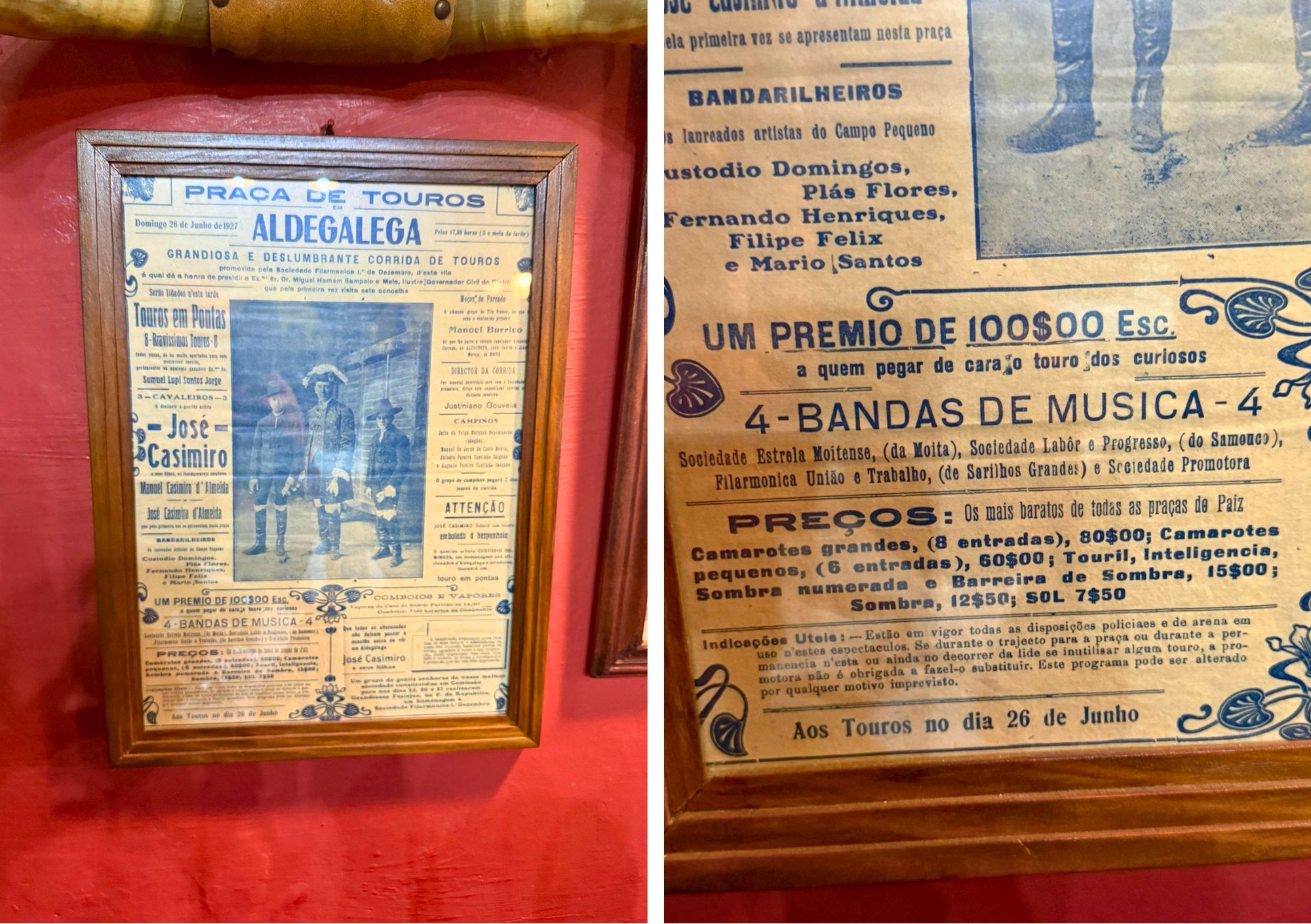 O cartaz anunciava ainda UM PRÉMIO DE 100$00 ESC. a quem pegar de cara o touro dos curiosos – uma prática curiosa da época que demonstra a envolvência do público nos espetáculos tauromáquicos.